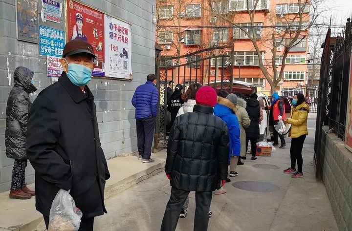 河北設(shè)備員工在所在社區(qū)組織居民排隊(duì)采買蔬菜等生活必需品